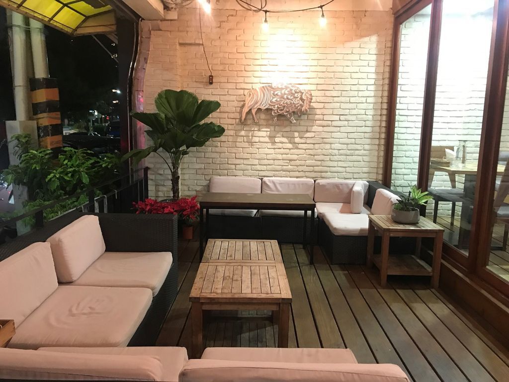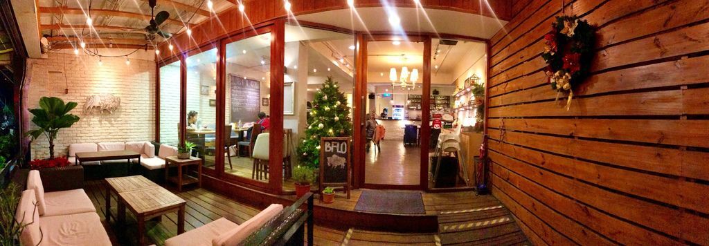 水牛城大直木紋裝潢的風格跟戶外的沙發區看得很舒服,